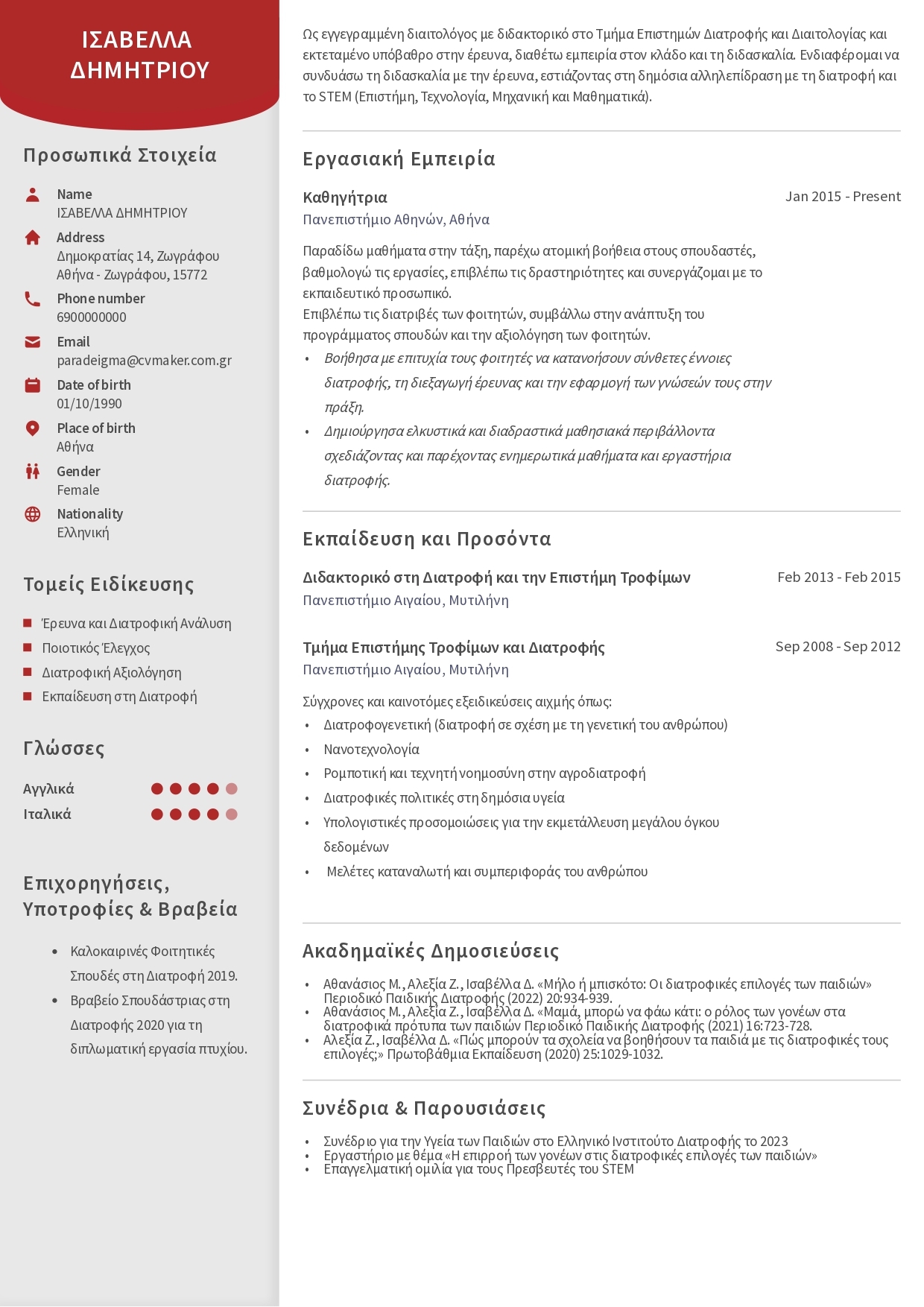 Η Ισαβέλλα Δημητρίου, μια ακαδημαϊκός και καταξιωμένη επαγγελματίας, επέλεξε το πρότυπο βιογραφικού Edinburgh για να αναδείξει την εμπειρία της. Συνδυάζει άψογα τη διδασκαλία, την έρευνα και την εκπαίδευσή της στους τομείς της διατροφής και του STEM (Επιστήμη, Τεχνολογία, Μηχανική και Μαθηματικά), δημιουργώντας ένα ακαδημαϊκό βιογραφικό που θα την κάνει να ξεχωρίσει.