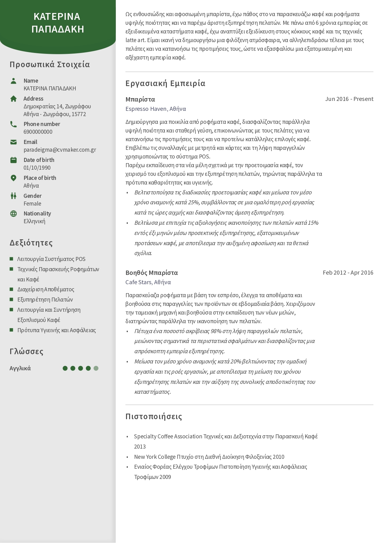 Παράδειγμα βιογραφικού σημειώματος μπαρίστα