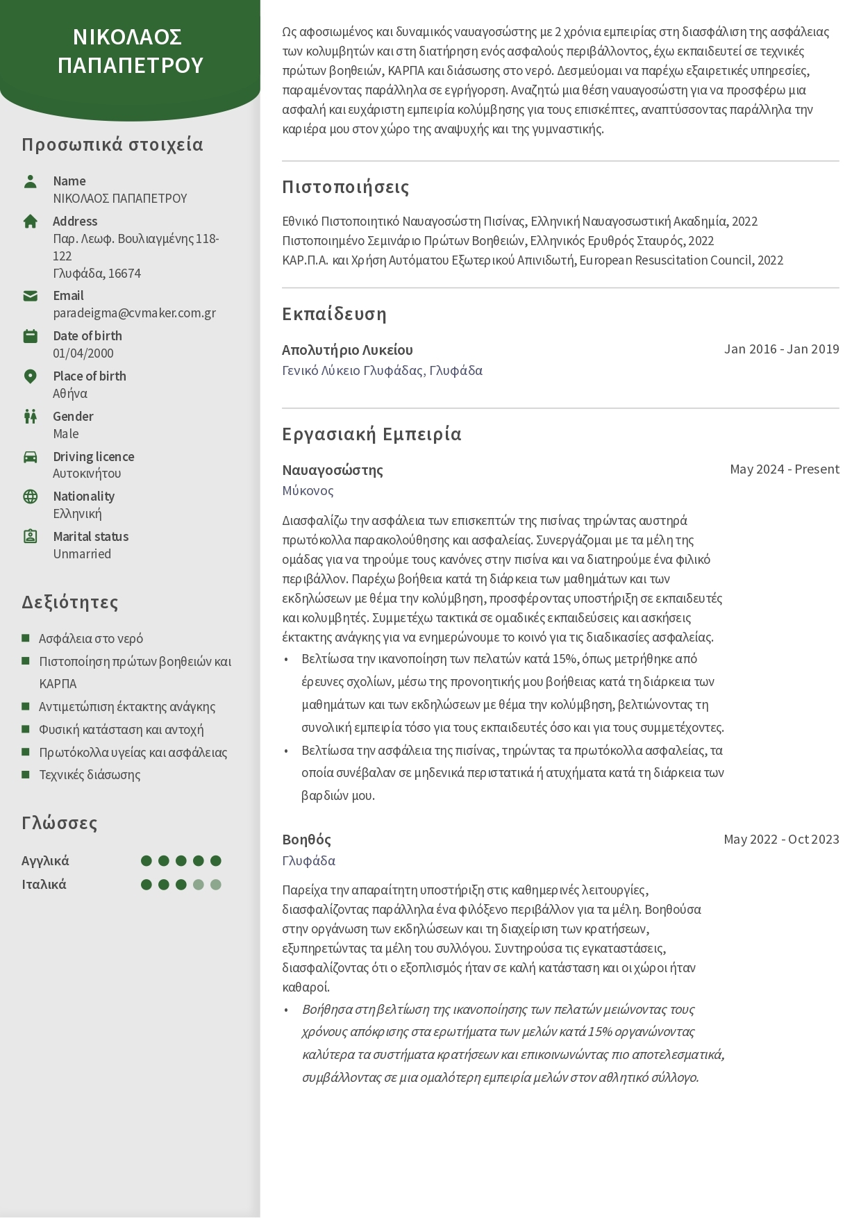 - Παράδειγμα βιογραφικού σημειώματος ναυαγοσώστη στην Ελλάδα.