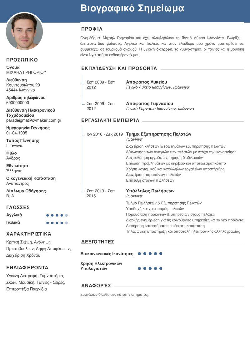 Όπως μπορείτε να καταλάβετε από το παραπάνω παράδειγμα βιογραφικού, ο Μιχαήλ είναι ένας απόφοιτος Λυκείου που αναζητάει έναν ρόλο στην εξυπηρέτηση πελατών για να συνεχίσει τη σταδιοδρομία του. Διαθέτει ήδη σχετική εργασιακή εμπειρία τόσο ως υπάλληλος πωλήσεων όσο και στην εξυπηρέτηση πελατών. Αυτό μαζί με το γεγονός ότι γνωρίζει άπταιστα δύο γλώσσες ίσως αποτελέσει πλεονέκτημα για τον ίδιο σε σχέση με άλλους υποψήφιους που δεν διαθέτουν καθόλου εμπειρία. Προκειμένου να κάνει την αίτησή του να ξεχωρίσει, αναφέρει επίσης τα ενδιαφέροντά του εστιάζοντας στο γεγονός ότι συμμετέχει σε τουρνουά σκακιού. Ο Μιχαήλ επέλεξε να χρησιμοποιήσει το σχετικά χαλαρωτικό απαλό πράσινο σε συνδυασμό με το πρότυπο βιογραφικού «Cambridge» με την φωτογραφία του. Με το εργαλείο δημιουργίας βιογραφικών μας, είναι εύκολο να κάνετε εναλλαγή σε ένα διαφορετικό πρότυπο.
